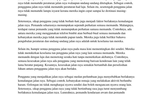 Usaha yang diambil oleh pelbagai pihak umpama mencurah air ke daun keladi kerana bilangan kes kemalangan jalan raya terus meningkat. Dalam hal ini, kecuaian manusialah yang menjadi penyebab utama. Tragedi ini berpunca daripada beberapa faktor. Peraturan jalan raya haruslah dipatuhi untuk memastikan keselamatan semua pihak. Jangan gopoh gapah semasa memandu kerana kecuaian menjadi punca nyawa sendiri . Nie.dpt cikit maklumat untuk wat karangan nanti. Punca kemalangan jalan raya berlaku. Negara kita merupakan antara negara yang mempunyai angka kematian akibat kemalangan yang tinggi. Faktor utama yang menyebabkan berlakunya kemalangan jalan raya ialah sikap pengguna jalan raya itu sendiri. Kadar kematian jalan raya di negara kita semakin meningtkat. Apakah punca berlakunya kemalangan jalan raya dan langkah untuk mengatasinya.